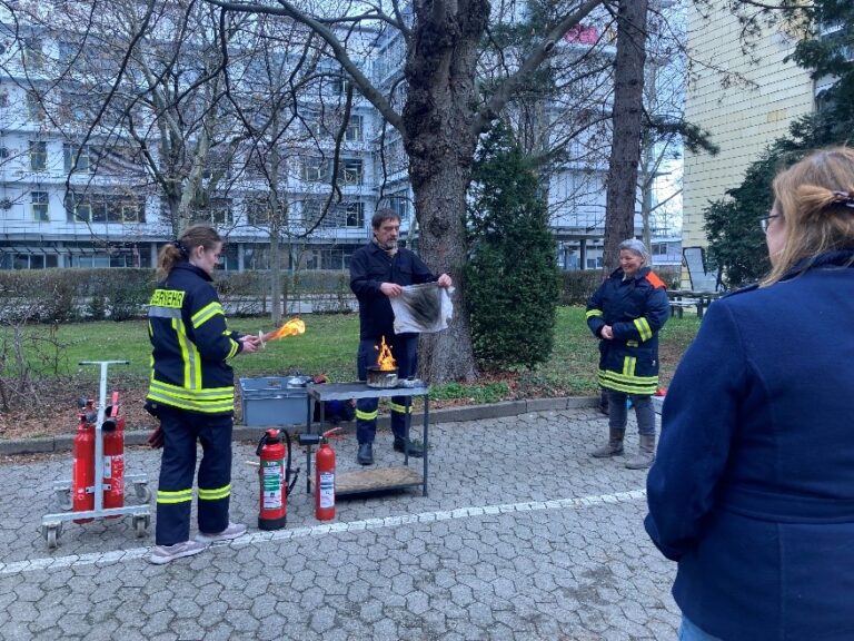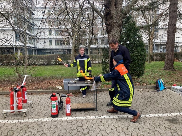 Teil der Fortbildung war eine zertifizierte Brandschutzhelfer*innenausbildung. Nachdem Gefahren einer Brandstelle oder unterschiedliche Feuerlöschtypen theoretisch besprochen waren, führten die Teilnehmenden bei der Stabsstelle Sicherheit der Universität Freiburg Feuerlöschübungen eigenständig durch: Mithilfe eines Küchentuchs wurde ein Topfbrand erstickt; ein Personenbrand wurde simuliert und ein Entstehungsbrand bekämpft.