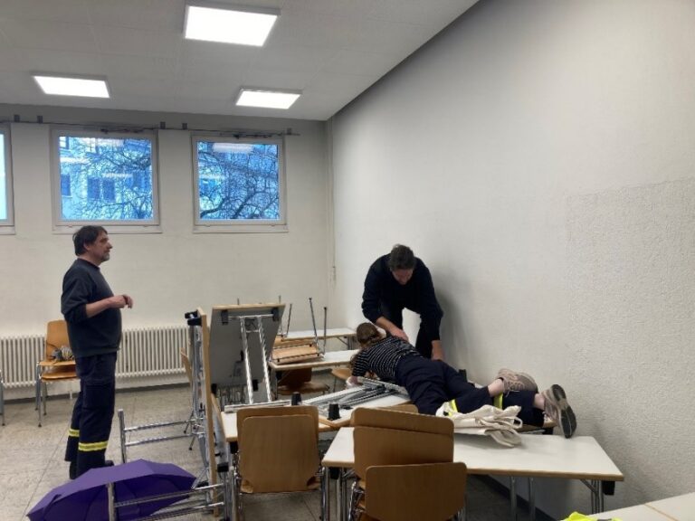 Am Nachmittag verschafften sich die Teilnehmenden durch einen Hausrundgang einen Überblick über die Brandschutzausstattung, beispielsweise die Verteilung von Sicherheits- und Rettungszeichen oder Evakuierungswegen. Bei den anschließenden Evakuierungsübungen zeigten die Teilnehmenden ebenso viel Einsatz wie beim Durchqueren eines Parcours bei „Nullsicht-Bedingungen“ (mit verschlossenen Augen). Gegen Ende des Tages wurden verschiedene Szenarien, beispielsweise die Koordination einer Notunterkunft in einer Sporthalle, besprochen und gespielt.