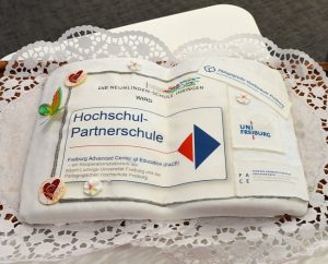 Die Gemeinschaftsschule Neunlinden-Schule in Ihringen unterzeichnete am 1. Dezember 2017 als elfte Hochschulpartnerschule der Albert-Ludwigs-Universität und der Pädagogischen Hochschule Freiburg den Kooperationsvertrag. Mit einer besonderen Torte überraschte der Schulrektor und das Team der Ansprechpartner*innen das Leitungstandem Prof. Dr. Lars Holzäpfel (PH) und Prof. Dr. Wolfgang Hochbruck (Universität), die zu diesem feierlichen Anlass zur Neunlinden-Schule nach Ihringen kamen.