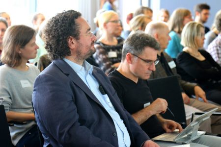 Auch das Kooperationsprojekt „Kooperative Musiklehrer/innenbildung Freiburg“ (KoMuF) war wieder vertreten. Nach einer kurzen Einleitung von Prof. Dr. Thade Buchborn, Projektleitung KoMuF an der Musikhochschule, stellte Jonas Völker seine Studie im Teilprojekt 4 „Interkulturalität und Musikunterricht“ vor. Sehr anschaulich legte er am Beispiel einer Unterrichtseinheit zu Samir Mansour, einem in Syrien geborenen Sänger und Oud-Spieler (arabische Laute), der sich nun in Deutschland als „Botschafter der orientalischen Kultur“ einsetzt, dar, wie interkulturelles Lernen im Musikunterricht ablaufen kann.
