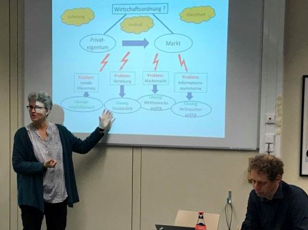Im Fokus des zweiten Termins standen dann die Diskussion der von den Teilnehmer*innen selbst erstellten Materialien sowie von Schulbuchkapiteln zum gleichen Thema anhand fachdidaktischer Kriterien. Darüber hinaus führten die Referent*innen in das Themenfeld Wirtschaftsordnung und die damit verbundenen Grundlagen der Sozialen Marktwirtschaft ein. Viel Raum für Diskussion trug dazu bei, dass die Lehrkräfte sich angeregt über fachliche Grundlagen austauschen konnten. Für die Erstellung, Durchführung und Evaluation eigener Unterrichtssequenzen im Fach WBS sind die Teilnehmer*innen nun gerüstet. Um die fachdidaktischen Anregungen zu vertiefen, erhielten sie eine Liste mit fachspezifischer Literatur.