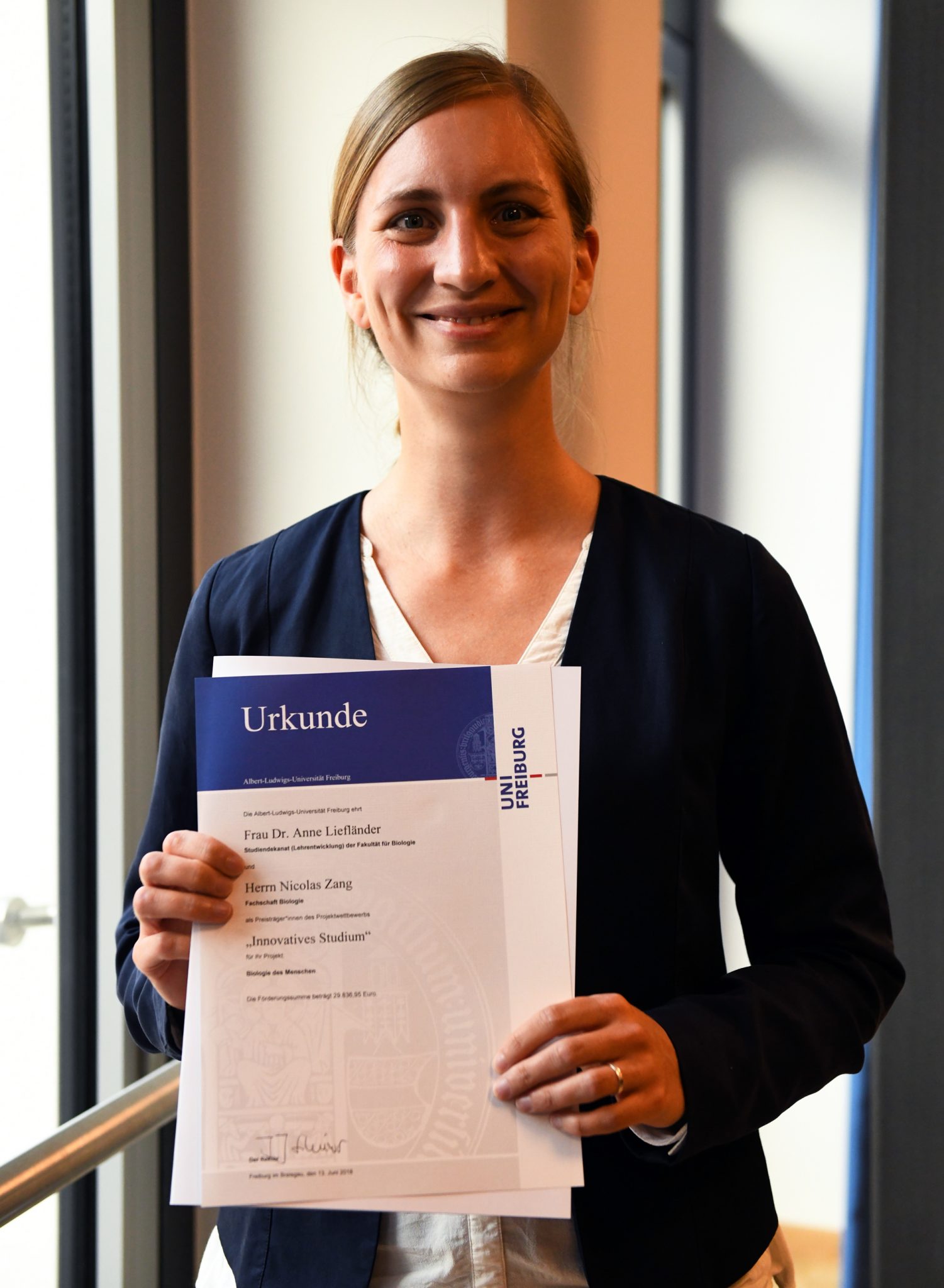 Die FACE-Projektmitarbeiterin Dr. Anne Liefländer überzeugte den StuRa mit der Konzeption einer neuen, professionsorientierten und innovativen Lehrveranstaltung „Biologie des Menschen“. Die offizielle Preisverleihung fand am 13. Juni 2018 beim Dies Universitatis statt.
