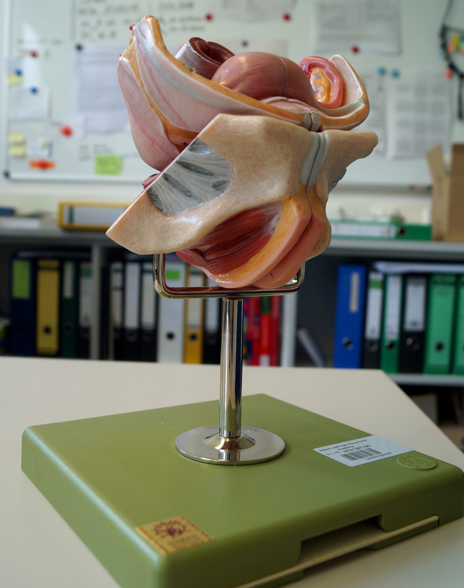 Neben den Hiwis braucht man auch die Ausstattung. Für die Aktivierung aller Studierenden lassen wir sie in Kleingruppen arbeiten. Daher brauchen wir z.B. Modelle nicht einmal, sondern 3 bis 4 Mal. Wenn du ein Bild hast, das ist 2D. Du kannst es dir nicht richtig vorstellen, wie z.B. die weiblichen Geschlechtsorgane im Becken angeordnet sind und wie sie in 3D aussehen. Deshalb ist der Einsatz von Modellen so extrem wichtig. Aber gute Modelle sind richtig teuer. Deshalb wäre der Kurs ohne das Geld so nicht möglich.