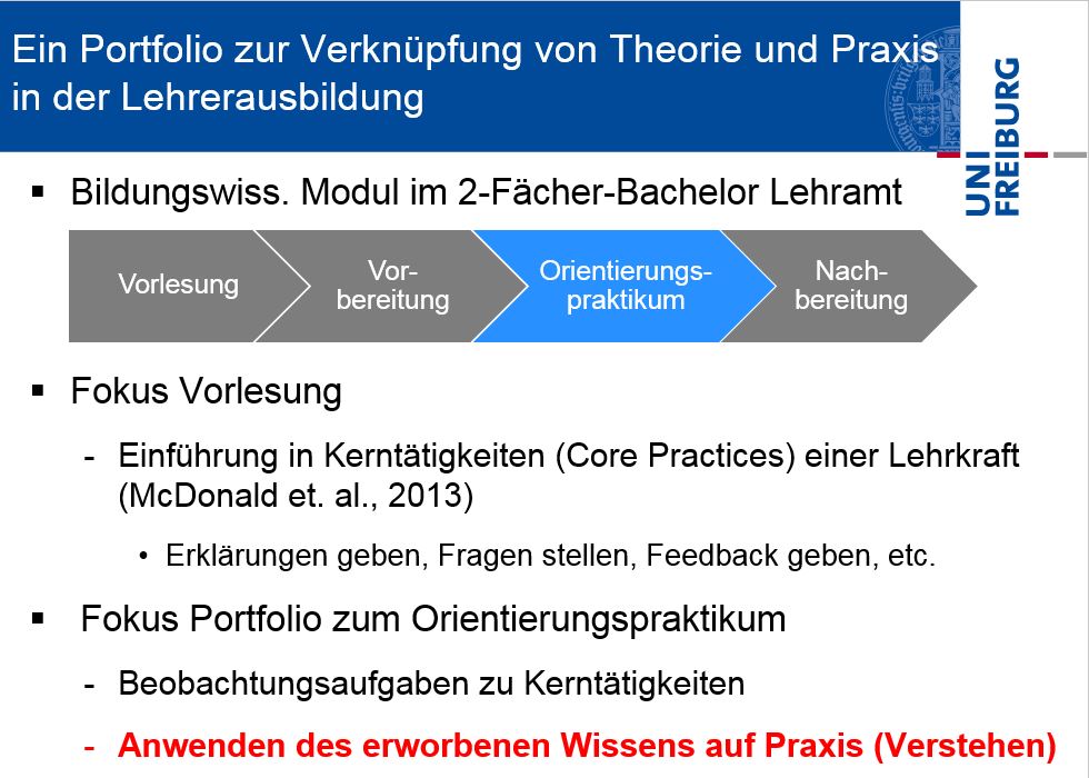 Als Instrument der Reflexion und Dokumentation dient dabei das Portfolio, welches als „Methode zur Förderung selbstgesteuerter Kohärenzkonstruktion in der Lehrerbildung“ (Nückles et al., 2019, S. 219) einen zentralen Bestandteil in der Freiburger Konzeption des Orientierungspraktikums darstellt. So führen Studierende z.B. angeleitet durch die bereitgestellten Materialien Unterrichtsbeobachtungen durch und können auf der Grundlage bildungswissenschaftlicher Kenntnisse Unterricht in seiner Komplexität wahrnehmen, beschreiben und analysieren. Im Kontext des Orientierungspraktikums ermöglicht die Bearbeitung der Aufgaben im Portfolio den Studierenden ein hohes Maß an selbstgesteuertem Lernen (z.B. durch die Möglichkeit des Auswählens von Aufgaben) sowie in Hinblick auf die Beobachtung zentraler Lehrtätigkeiten eine hohe Kohärenz zwischen Theorie und Praxis.