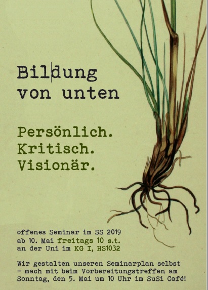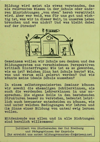 „Das Seminar Bildung von unten (initiiert von Studierenden und Pädagog*innen der Kapriole) geht im kommenden Sommersemester 2019 voller Vorfreude in die dritte Runde! Am 5. Mai sind alle Interessierten um 10 Uhr (s.t) ins Susi Café (Vauban) eingeladen, um gemeinsam einen Seminarplan zu gestalten. Das Seminar soll Raum bieten für kritische Fragen an das Bildungssystem, theaterpädagogische Elemente, Exkursionen, Inklusion, abwechslungsreiche Diskussionsformate zu spannenden Themen und vieles mehr. Es ist uns wichtig, dass sich die Themen am Interesse und an den Bedürfnissen der Teilnehmenden orientieren. Nach einer gemeinsamen Seminarplangestaltung am 5. Mai, wollen wir dann am Freitag den 10. Mai um 10 Uhr s.t. (!) im Raum HS 1032 mit der ersten Sitzung starten. Bei Fragen einfach gerne eine Mail an: bildungvonunten-fr@riseup.net„