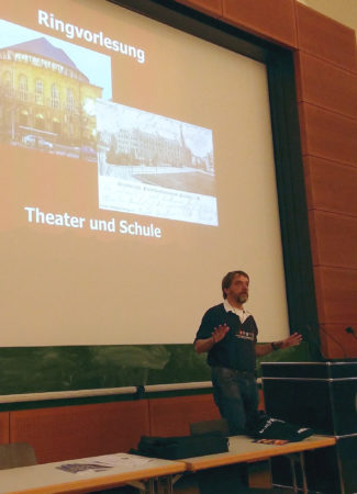In seiner von vielen Bildbeispielen unterbauten Vorlesung ging Hochbruck auf Ähnlichkeiten und Unterschiede zwischen Schulen, Sportstadien und Zirkusarenen, antiken und modernen Theaterbauten, das theatrale Potential öffentlicher Räume wie Straßen, Plätze, Restaurants und Bistros, und auf die zeitweilige Dominanz sakraler Bauten in der Theatergeschichte ein.