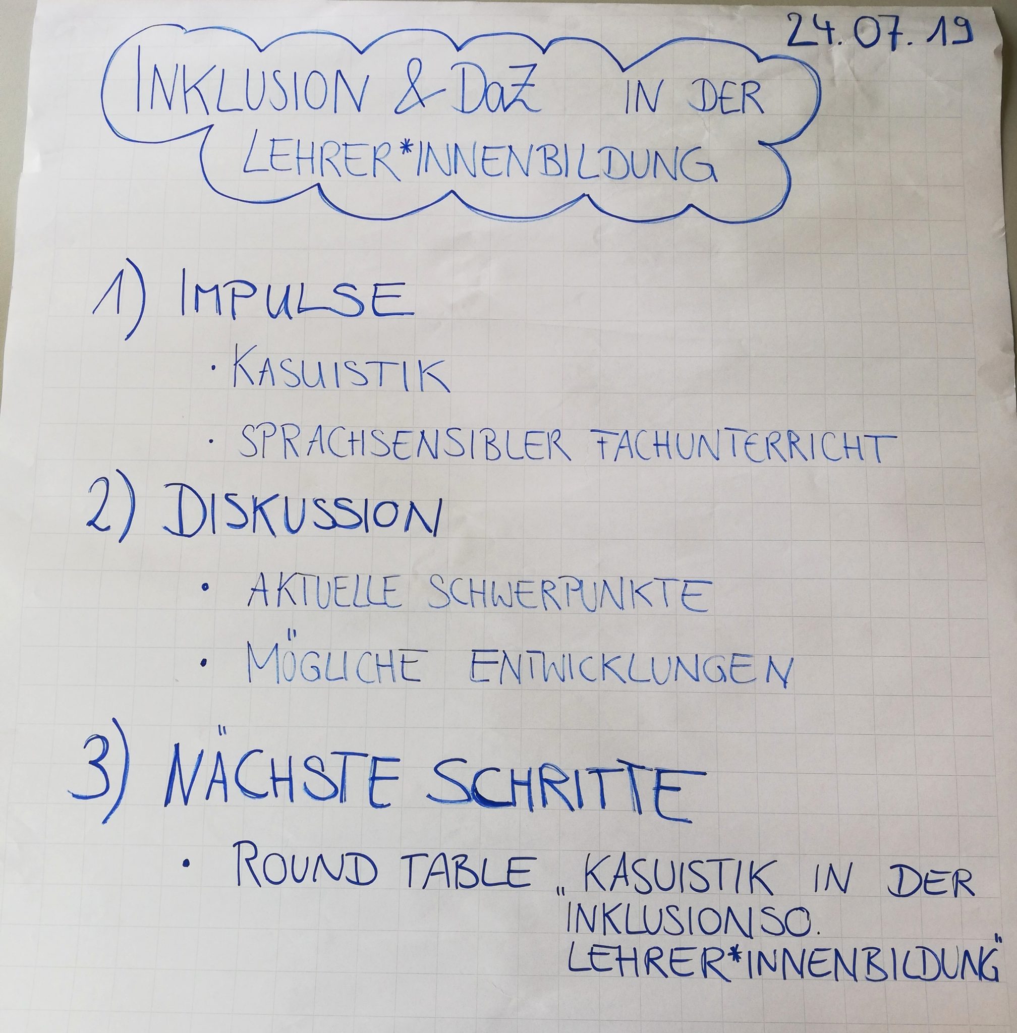 Am 24. Juli 2019 fand ein interdisziplinäres Kooperationstreffen der Pädagogischen Hochschule Freiburg und der Albert-Ludwigs-Universität Freiburg zum Thema „Inklusion und DaZ – Querschnittsaufgaben in der Lehrer*innenbildung“ statt. Inspiriert von zwei Kurzimpulsen zu Kasuistik und zum SIOP-Modell tauschten sich die Teilnehmenden über fachbezogene und fachübergreifende Fragestellungen bezogen auf Inklusion und DaZ auf hochschuldidaktischer Ebene aus und vernetzten sich zur weiteren Zusammenarbeit.