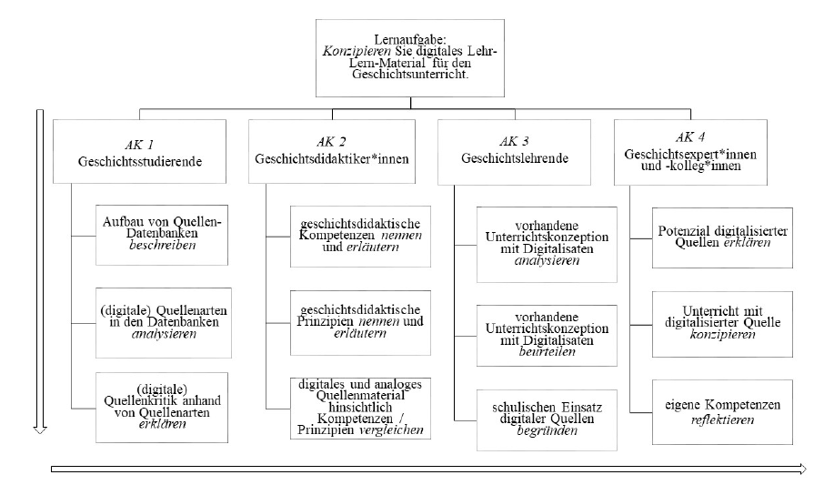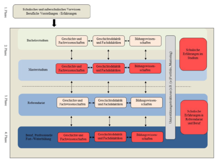 Im Sinne einer säulenübergreifenden Kohärenz wurden im ersten Abschnitt dieses Projektes fachwissenschaftliche, fachdidaktische, bildungswissenschaftliche sowie schulpraktische Kompetenzen gemäß einer professionellen Handlungskompetenz (vgl. Baumert & Kunter, 2006, S.482) miteinander verknüpft. Insbesondere lag der Fokus auf der Verknüpfung von Methoden und Verfahren der Geschichtswissenschaft mit denen der Geschichtsdidaktik (vgl. Handro, 2015, S.27; Sandkühler, 2016).