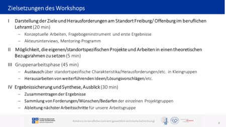 Der Themenschwerpunkt „Kohärenz im beruflichen Lehramt“ umfasste ebenfalls insgesamt 90 Minuten und wurde von der Arbeitsgruppe aus dem Projekt „FACE – Berufliches Lehramt“ der Pädagogischen Hochschule Freiburg mit Dr. Katharina Hellmann, Carsten Lange, Sebastian Gorski, Mandy Steinbach und Dr. Katharina Agostini gestaltet.