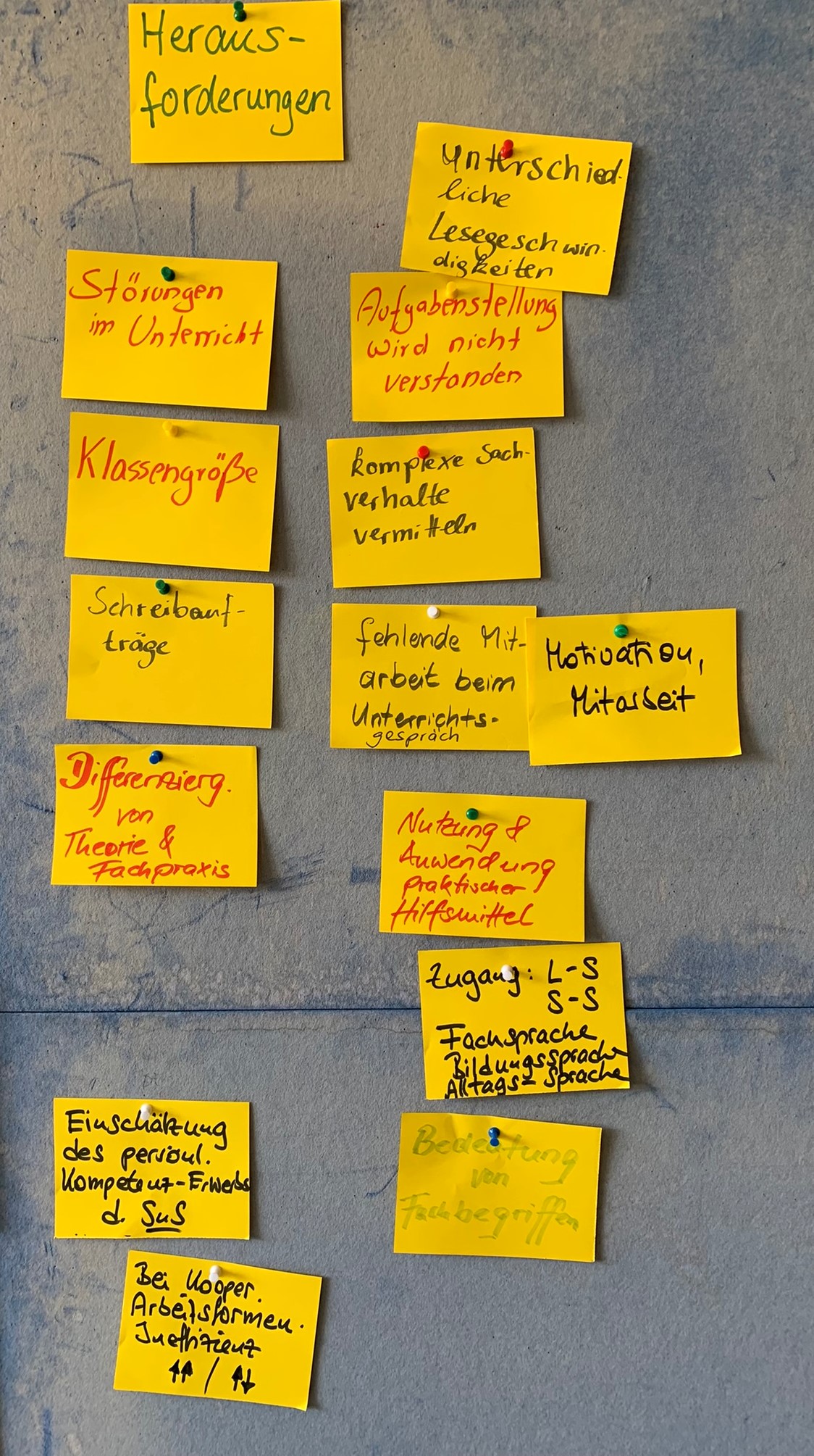 Den beiden Referentinnen der Pädagogischen Hochschule Freiburg, Prof. Dr. Gabriele Kniffka (Professorin für deutsche Sprache und ihre Didaktik und Leiterin des Bachelor-Studiengangs Deutsch als Zweit- und Fremdsprache (BA DaZ/DaF)) und Britta Kangas (Akademische Mitarbeiterin im Projekt „FACE – Berufliches Lehramt“), war es wichtig, erst einmal die Herausforderungen und Wünsche der Lehrkräfte zu erfassen.