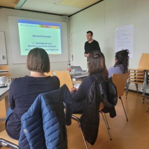 Am ersten Tag tauschten die Teilnehmenden ihre Erfahrungen aus und behandelten theoretische Konzepte zum Thema Feedback. Sie erörterten zunächst, was in einem Feedbackgespräch vermieden werden sollte, wodurch amüsante Beispiele entstanden, die aufzeigten, was alles schiefgehen kann. Anschließend wurden im Plenum die Merkmale eines erfolgreichen Feedbacks erläutert. Besondere Bedeutung kommt dabei der Objektivität zu, da das Feedback beschreibend sein sollte und nicht bewertend oder interpretierend.