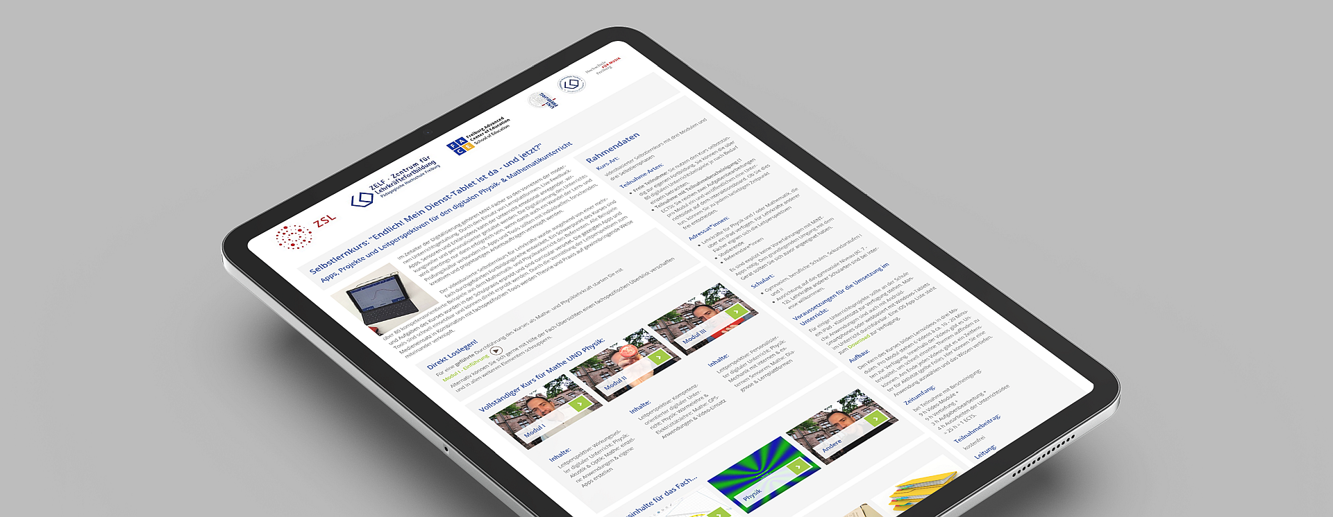 Seit Mitte letzten Jahres gibt es für Lehrkräfte der Fächer Physik und Mathematik der Klassenstufen 7 – 12 ein neues digitales Angebot der School of Education FACE: den Selbstlernkurs „Endlich! Mein Dienst-Tablet ist da – und jetzt? – Apps, Projekte und Leitperspektiven für den digitalen Physik- & Mathematikunterricht“. Mit 19 Videos in 3 Modulen, einem Interaktionsboard und Aufgaben zum Einreichen stellt der Kurs eine attraktive Alternative zur klassischen Fortbildung dar. Beate Epting vom Zentrum für Lehrkräftefortbildung ZELF der Pädagogischen Hochschule und Referent Dr. Patrick Bronner erläutern, was es damit auf sich hat.