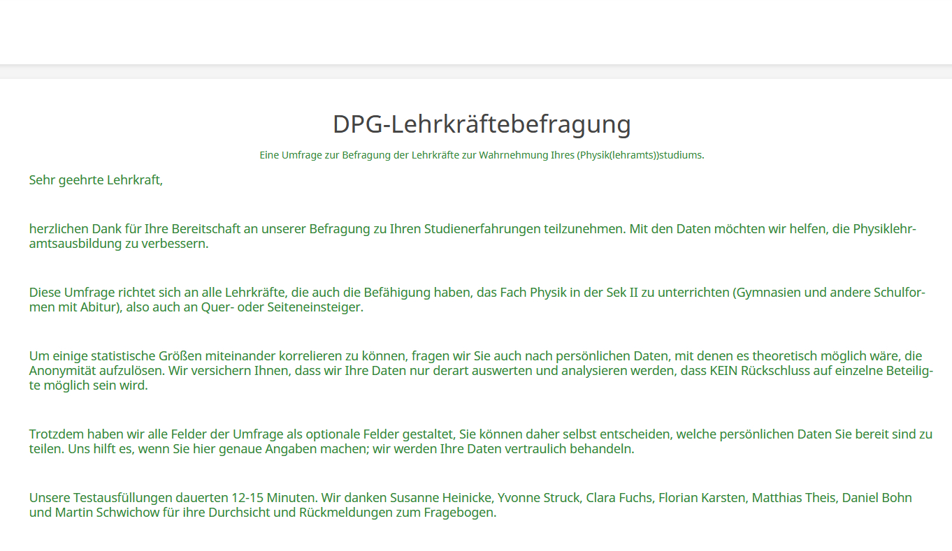 Die Befragung richtet sich richtet sich an alle Lehrkräfte, die auch die Befähigung haben, das Fach Physik in der Sek II zu unterrichten (Gymnasien und andere Schulformen mit Abitur), also auch an Quer- oder Seiteneinsteiger.