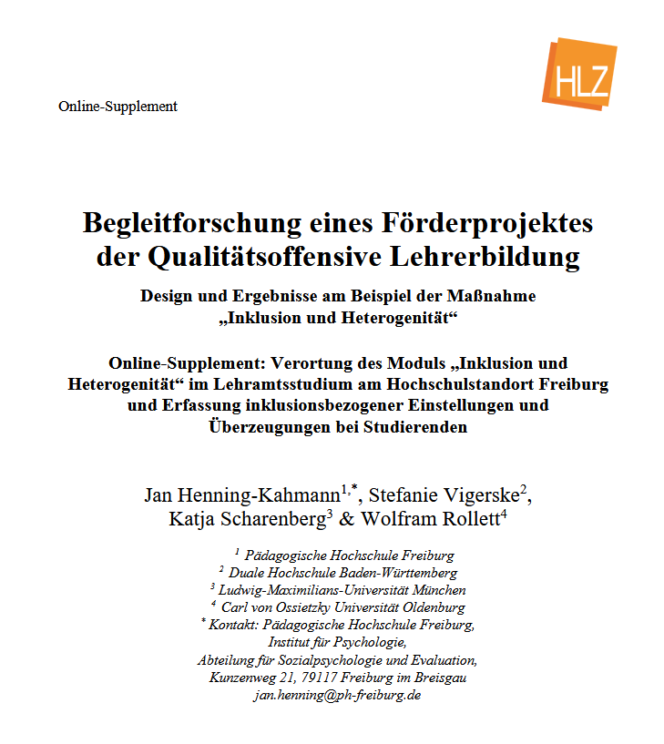 Henning-Kahmann, J., Vigerske, S., Scharenberg, K. & Rollett, W. (2024). Verortung des Moduls „Inklusion und Heterogenität“ im Lehramtsstudium am Hochschulstandort Freiburg und Erfassung inklusionsbezogener Einstellungen und Überzeugungen bei Studierenden. Herausforderung Lehrer*innenbildung. Zeitschrift zur Konzeption, Gestaltung und Diskussion, 7 (1), 432–450. [Online-Supplement: https://www.herausforderung-lehrerinnenbildung.de/index.php/hlz/article/view/6903/6704). (Open Access).