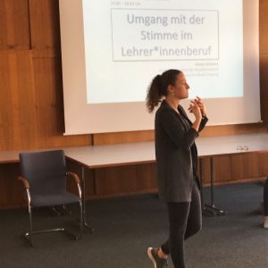 Im Oktober 2018 besuchten 18 Lehrkräfte aller Fächer und Schularten an zwei Nachmittagen im Abstand von zwei Wochen die FACE-Lehrkräfte-Fortbildung „Umgang mit der Stimme im Lehrer*innenberuf“ mit der Referentin Anna Immerz an der Albert-Ludwigs-Universität Freiburg.