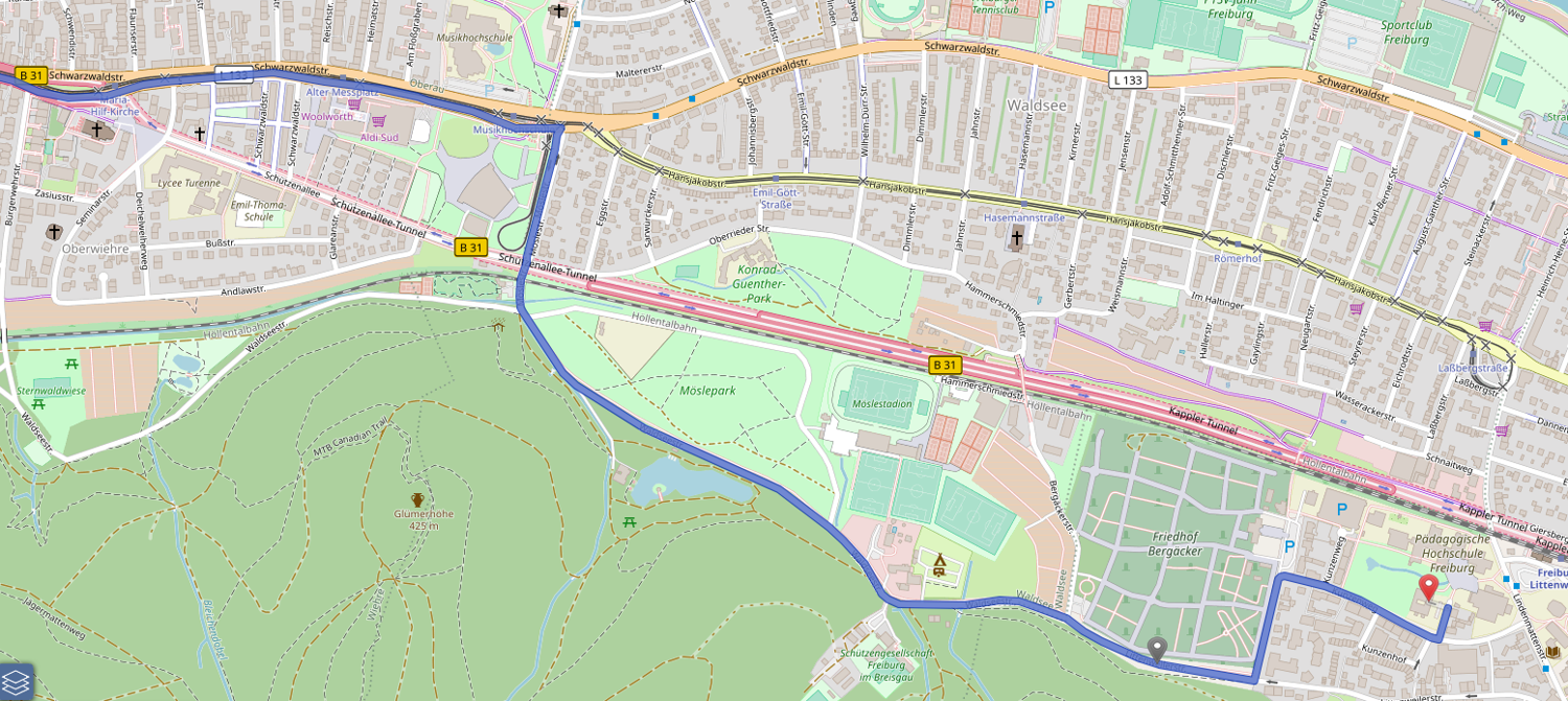 Autobahnausfahrt Freiburg-Mitte in Richtung Freiburg abfahren und stets geradeaus der Beschilderung „Titisee-Neustadt / Donaueschingen“ folgen (B31). Nach ca. 10 km, kurz nach der Brauerei Ganter, erreichen Sie eine Tunneleinfahrt. Direkt vor der Tunneleinfahrt müssen Sie auf die linke Spur wechseln und links am Tunnel vorbeifahren. Aufgrund der aktuellen Sperrung am Bahnhof Littenweiler (Höllentalbahnsanierung) muss von der B31 kommend eine Umleitung über die Möslestraße genommen werden. Die Umleitung ist ausgeschildert. Zum Parken können Sie das Parkhaus der Pädagogischen Hochschule Freiburg benutzen.