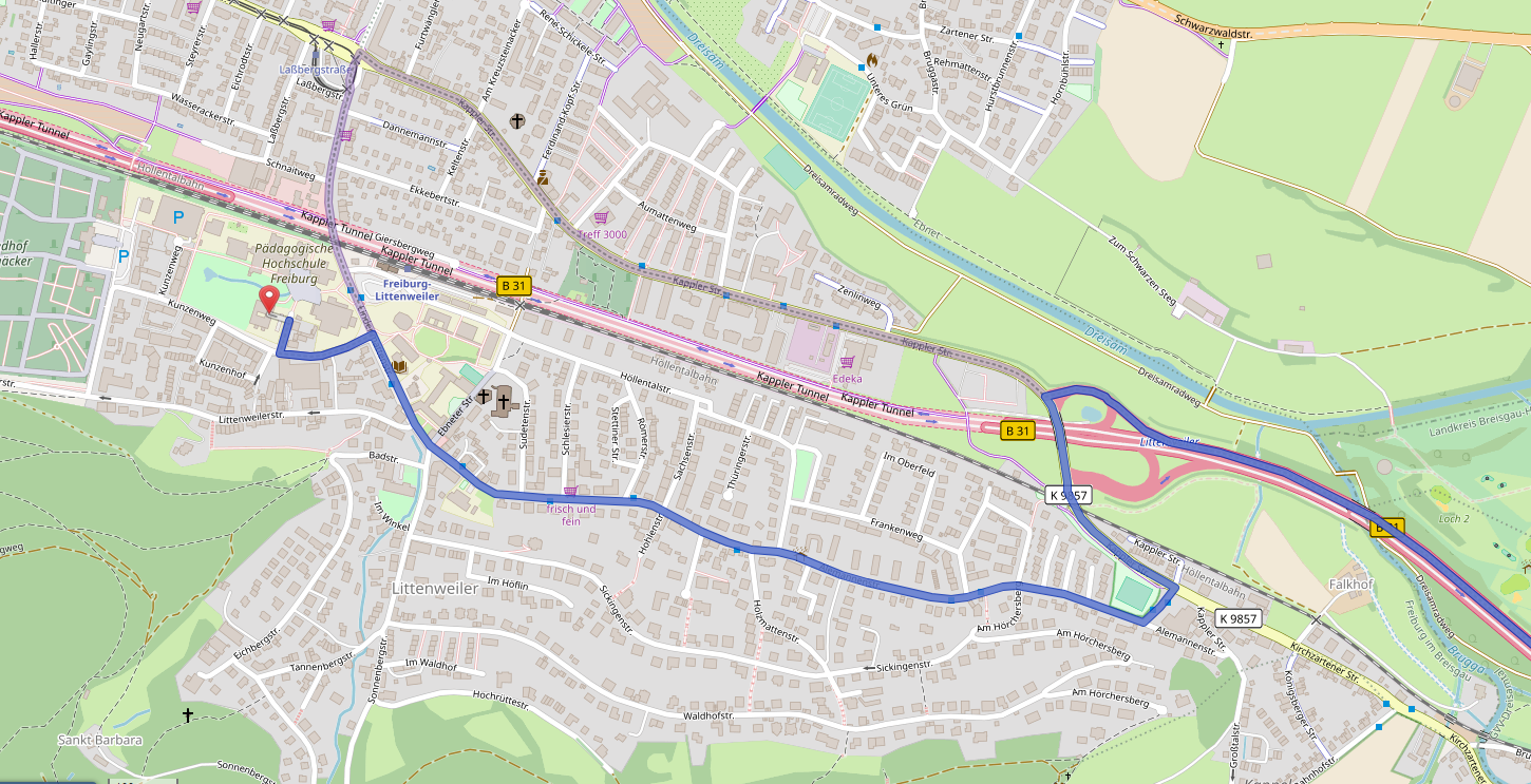 Hinweis: Die Höllentalbahn Freiburg – Titisee ist vom 01.03. bis zum 31.10.2018 wegen Bauarbeiten gesperrt, dies betrifft auch den Bhf. Littenweiler. Weitere Informationen finden Sie bei der Bauinformation der Deutschen Bahn.