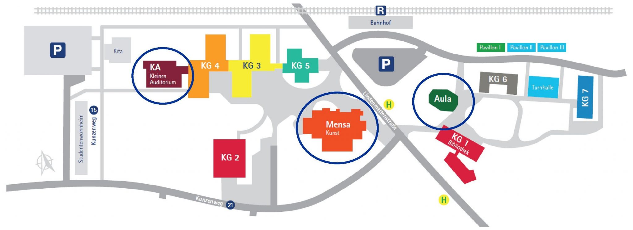 Im Lageplan sind die Gebäude der Pädagogischen Hochschule Freiburg markiert, in denen die Fachtagung „Bildungsforschung und Bildungspraxis im Dialog“ stattfindet.