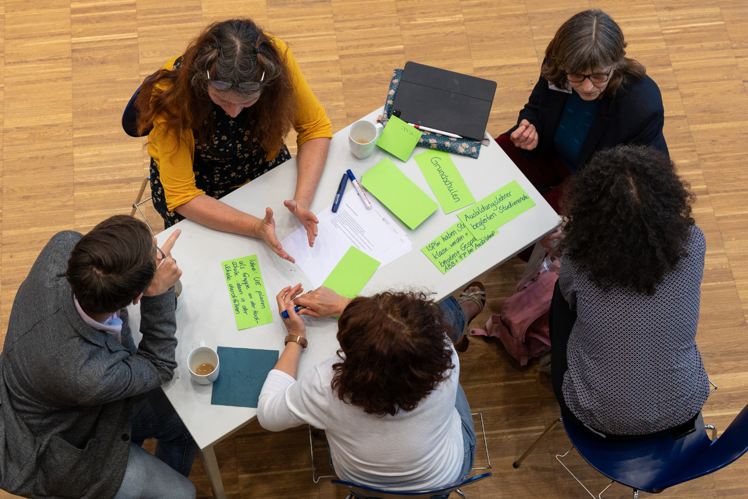 Participants of a meeting with the partner schools are brainstorming and taking notes on green cards
