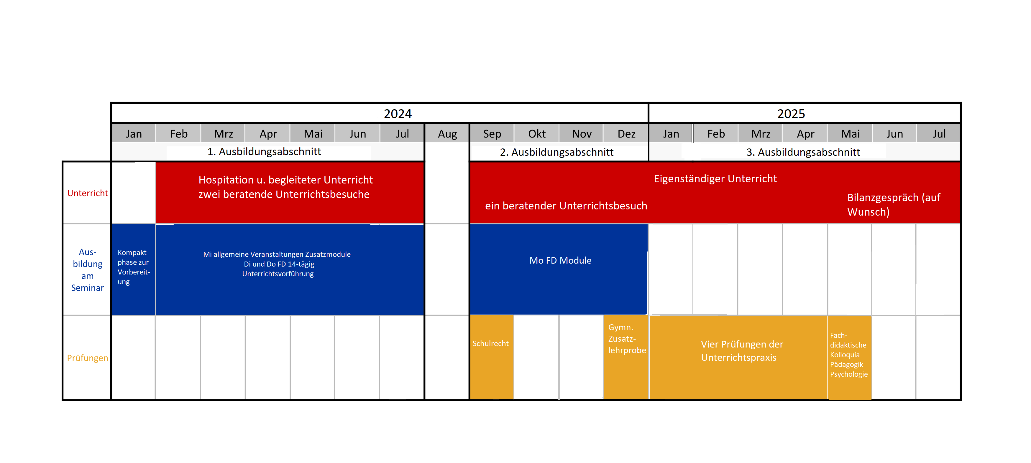 In der ca. 3-wöchigen Kompaktphase im Januar wird auf der Grundlage der Inhalte und Kompetenzen des Studiums in die Ausbildung eingeführt. Sie dient insbesondere der fachdidaktischen Vorbereitung auf eine baldige Unterrichtsaufnahme an der Schule und beschäftigt sich mit Pädagogik, Psychologie, Schul- und Beamtenrecht.