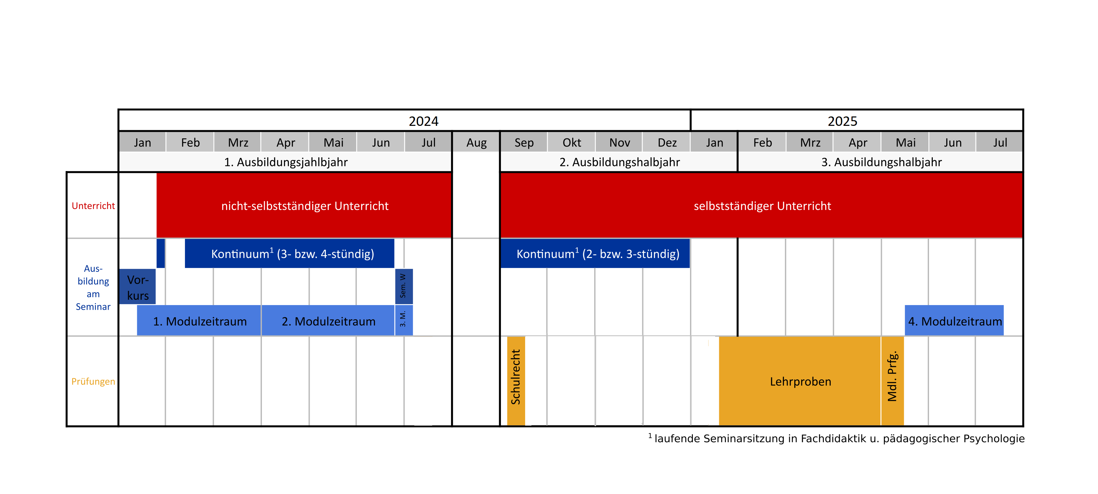Als Studienreferendar*in sind Sie verpflichtet, an den die eigene Ausbildung betreffenden schulischen Veranstaltungen und denen des Seminars sowie an der Staatsprüfung (Staatsexamen) teilzunehmen und die sonstigen im Rahmen der Ausbildung vorgeschriebenen Aufgaben zu erfüllen. Seminarveranstaltungen haben Vorrang vor schulischen Veranstaltungen.