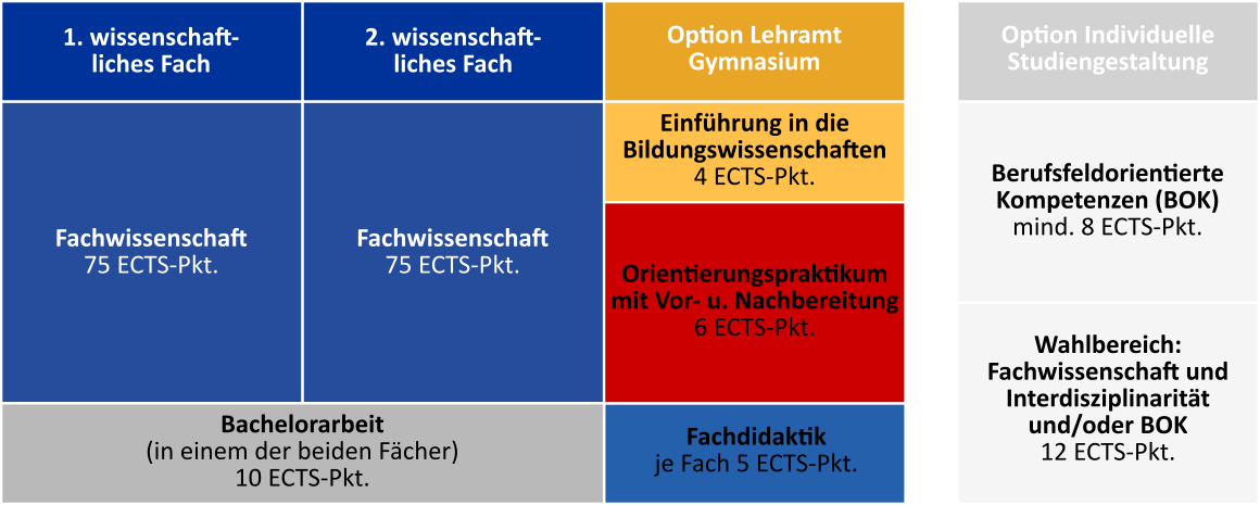 Der polyvalente Zwei-Hauptfächer-Bachelorstudiengang besteht aus zwei wissenschaftlichen Fächern, die in gleichem Umfang studiert werden, und einem Optionsbereich zur Wahl.