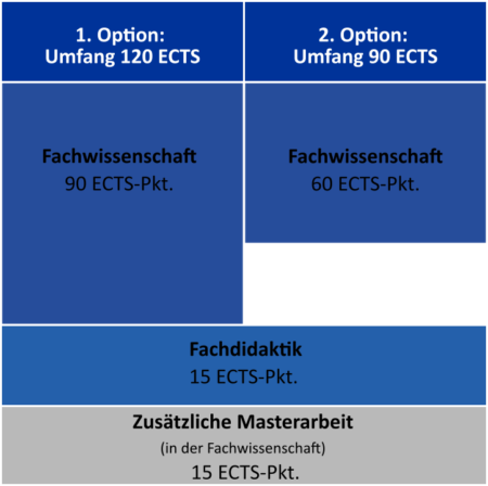 Beachten Sie bitte, dass in der Variante mit 120 ECTS-Punkten eine Masterarbeit mit fachdidaktischen Anteilen möglich ist. In der Variante mit 90 ECTS-Punkte muss die Arbeit fachwissenschaftlich ausgerichtet sein.