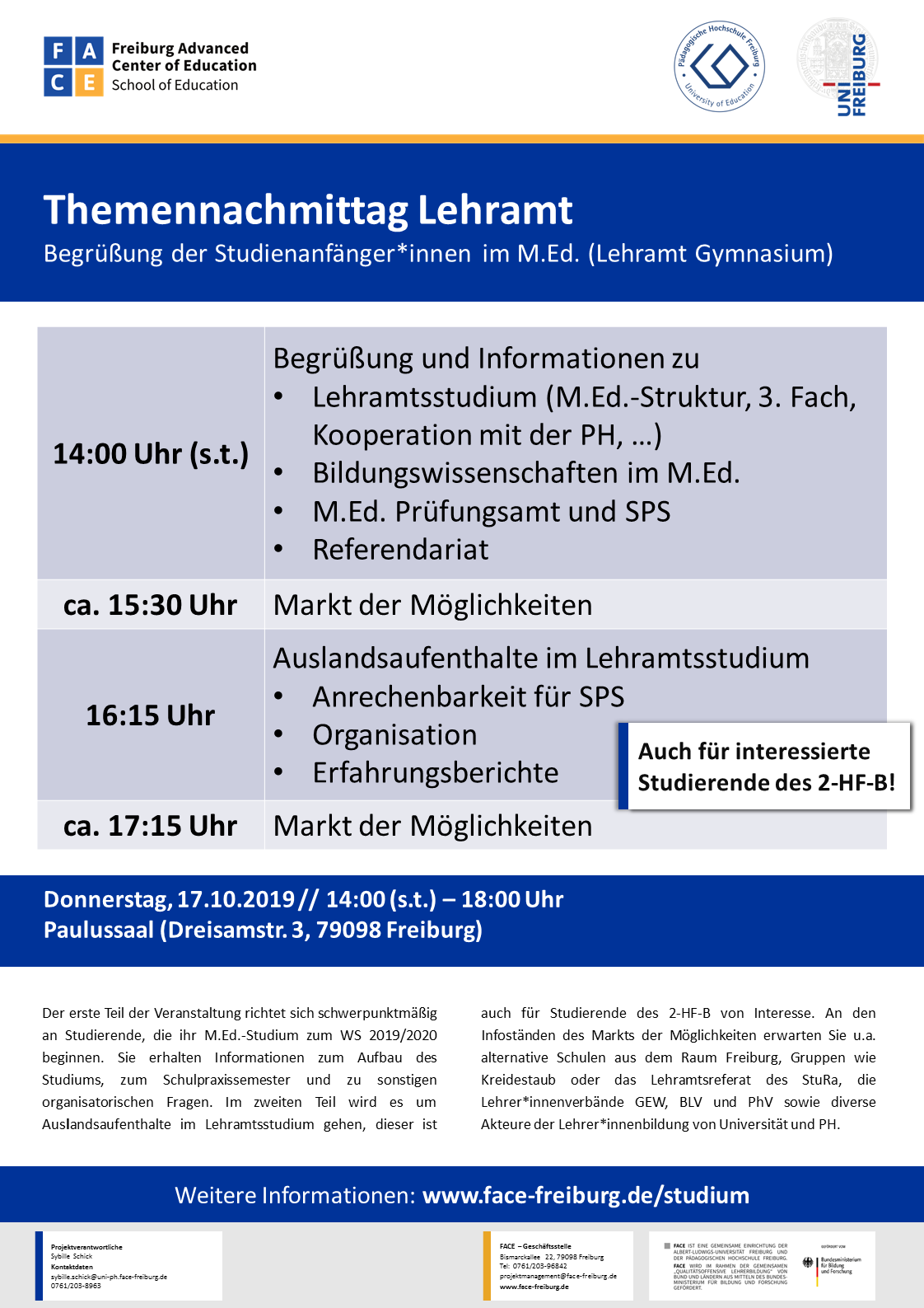 Für die Begrüßung der neuen Masterstudierenden im Lehramtsstudiengang (Master of Education) veranstaltet die Abteilung Beratung und Praxisvernet-zung der School of Education FACE, der gemeinsamen Einrichtung der Albert-Ludwigs-Universität Freiburg und der Pädagogischen Hochschule Freiburg, einen Themennachmittag Lehramt. Dieser wird am 17.10.2019 von 14:00 Uhr (s.t.) bis 18:00 Uhr im Paulussaal (Dreisamstr. 3, 79098 Freiburg) stattfinden.