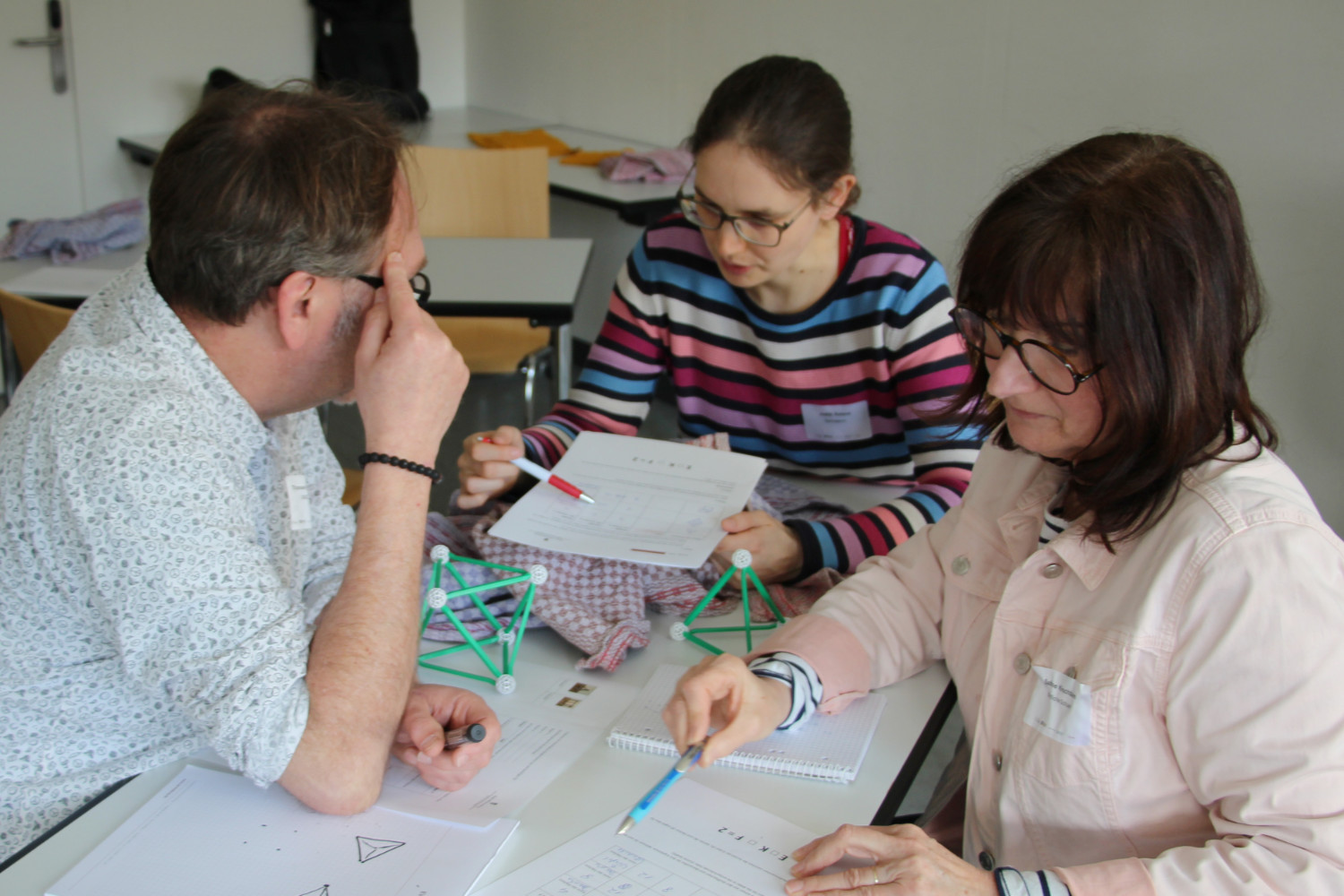 Three participants at a further training workshop are working on a task together